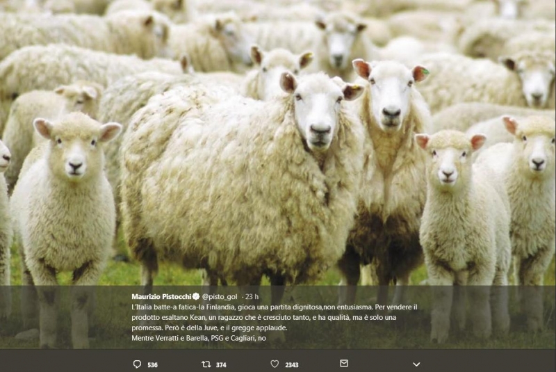 “L’Italia batte a fatica la Finlandia, gioca una partita dignitosa,non entusiasma. Per vendere il prodotto esaltano Kean, un ragazzo che è cresciuto tanto, e ha qualità, ma è solo una promessa. Però è della Juve, e il gregge applaude. Mentre Verratti e Barella, PSG e Cagliari, no”. Così il giornalista Maurizio Pistocchi su Twitter, il tutto accompagnato da una foto di un gregge di pecore.