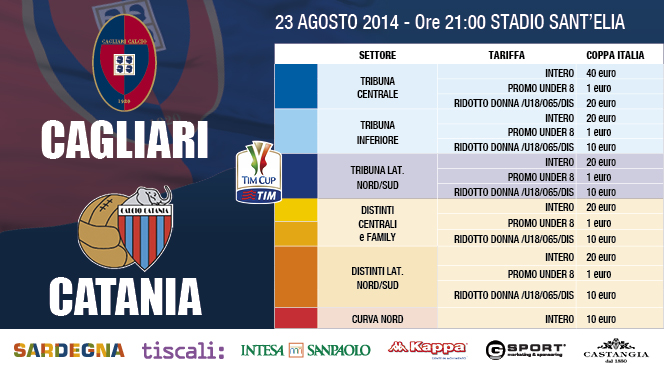Dalle ore 16.00 di martedì 19 agosto sarà possibile acquistare il biglietto per assistere alla partita Cagliari-Catania, valida per il 3° turno della TIM Cup 2014-15, in programma sabato 23 agosto allo stadio Sant'Elia con inizio alle ore 21.