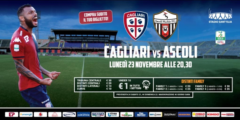 I biglietti per assistere alla gara tra Cagliari e Ascoli in programma lunedì 23 novembre alle ore 20:30 sono in vendita da questo pomeriggio presso: